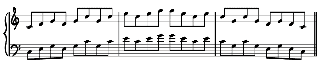 Let’s use the C major chord. Instead of playing C, E and G at the same time, you simply play these notes one at a time.