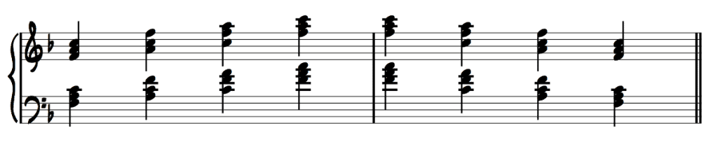 Let’s try this exercise with the F chord. The order of the notes of the root position is F, A and C. The order of the notes of the first inversion is A, C and F. The order of the second inversion is C, F and A. As mentioned earlier, you can practice these on two octaves or on the whole piano register.Â